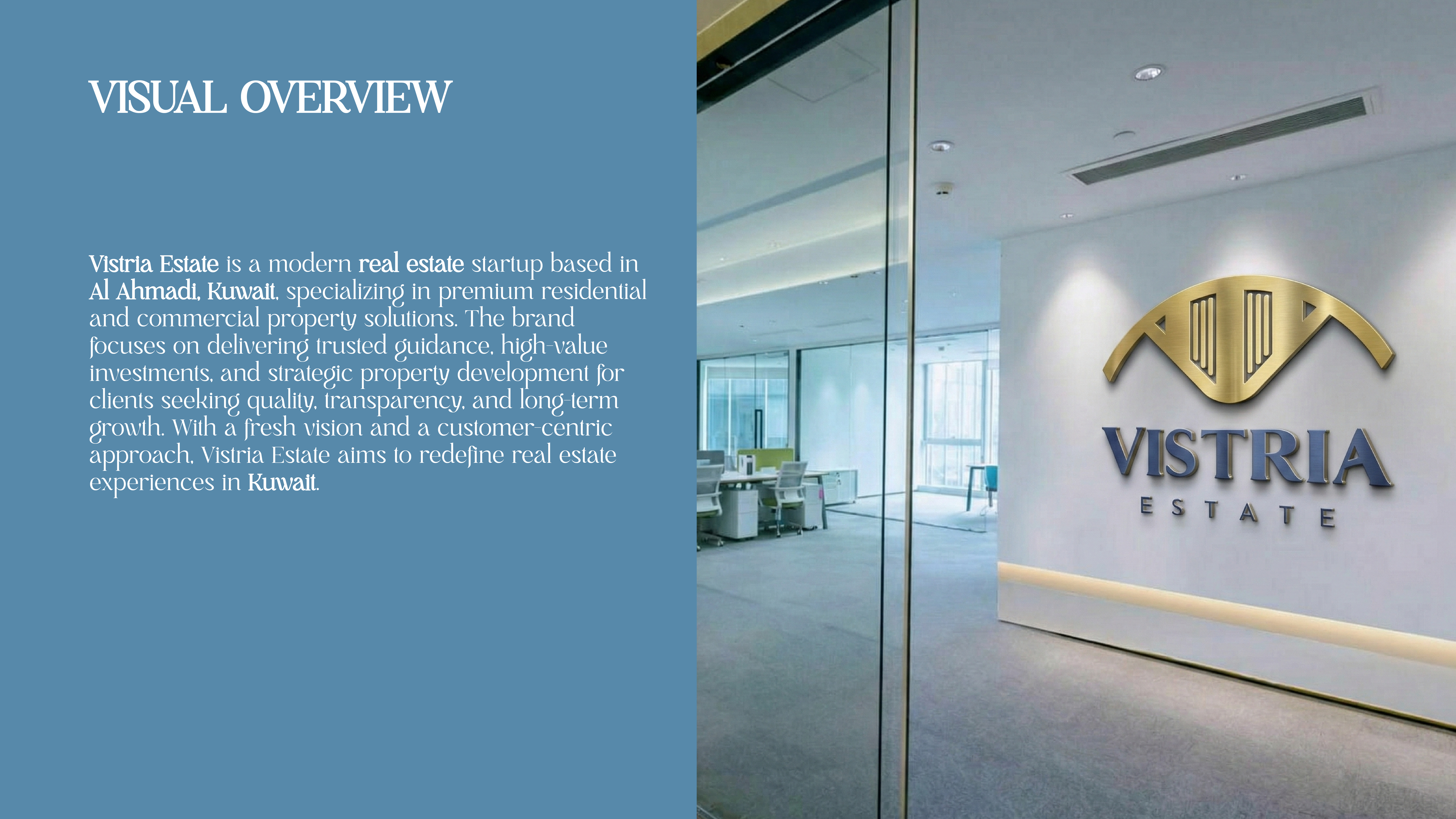 Vistria Estate is an emerging real estate startup in Kuwait aiming to establish a strong presence in the competitive Kuwaiti property market. However, their earlier brand identity did not reflect the premium, trustworthy, and high-value image needed to attract local investors and clients. To appeal to Kuwait’s sophisticated market, Vistria Estate required a refined and upscale branding approach—one that communicates luxury, reliability, and modern real estate expertise