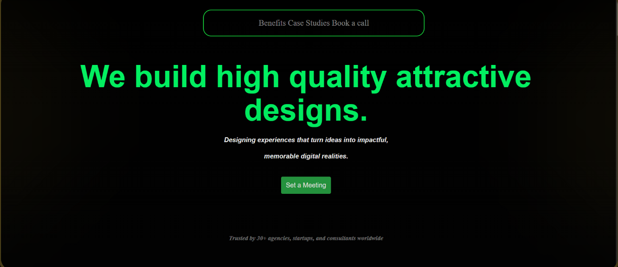 This website was created by blending clean design thinking with practical front-end development. I began by focusing on the user's first impression, using a bold headline and high-contrast colors to instantly grab attention. A dark background was chosen to give the design a premium feel, while bright green highlights guide the user's eyes toward important actions.